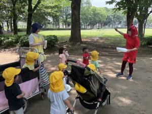 園のすぐ隣は富里中央公園です。 近隣のかたに元気にあいさつ。 湿性植物園を元気にひとまわりを楽しんでいます。