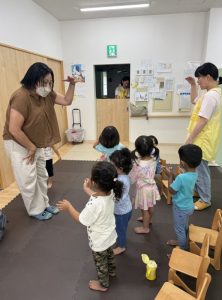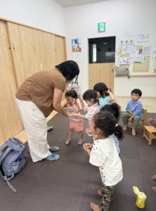 ルカせんせいによる英語遊び。 月に2回行います。 英語の歌や踊りもすっかり慣れて みんなで元気に参加しています。